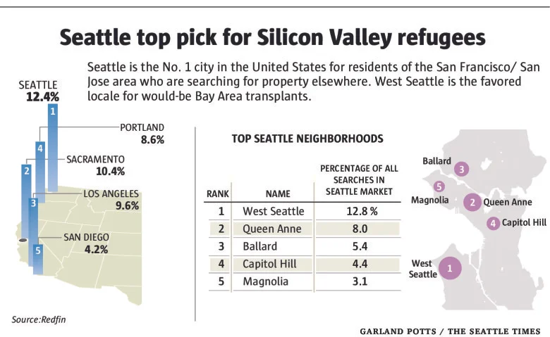 According to Seattle Times, "Seattle is the No.1 city in the United States for residents of the San Francisco/San Jose area who are searching for property elsewhere. West Seattle is the favored locale for would-be Bay Area transplants." Furthermore, Northwest Multiple Listing Services reported the average price for West Seattle being $506,600 - up 17.3 percent in the past year and a whopping 83% in the last five years. But, looking at the entire city, the average Seattle house now costs $641,250 - a mountainous figure for the average Seattleite yet a bargain for San Francisco/San Jose transplants where the median home price has now surpassed $1 million. Even though tech jobs in Silicon Valley pay better than anywhere else, they still don't pay well enough to offset the ridiculous cost of housing.